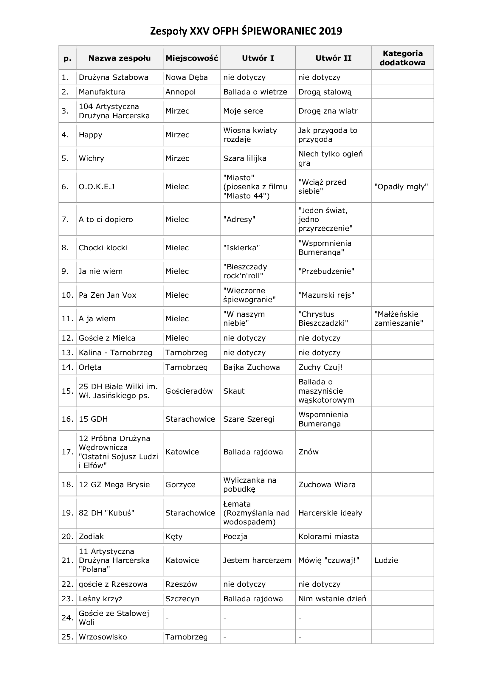 Zespoły XXV OFPH ŚPIEWOGRANIEC 2019